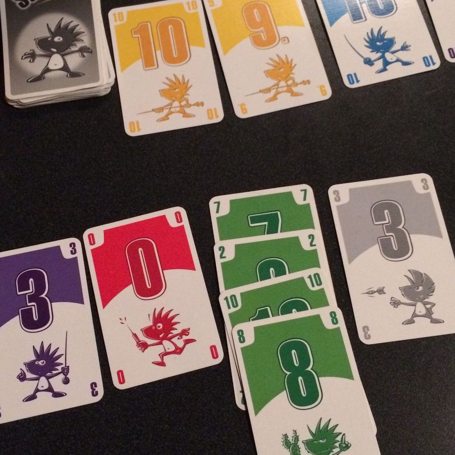 This is the second time we’ve played it. I’ve had it since months before it was a nominee for the Spiel des Jahres award (the biggest award a game can win), and I never got it to the table until a few weeks ago. It’s really great! You’ve got to either play something bigger (a set or run) than what was already played, or you have to give your opponent a point and take one of their played cards. You play til a hand is unbeaten around the table or til someone goes out, playing all their cards. Cards remaining in your hand are negative points, and any hands you beat with your own hands are positive points. Play as many rounds as there are players, and call it a game. Most points wins.