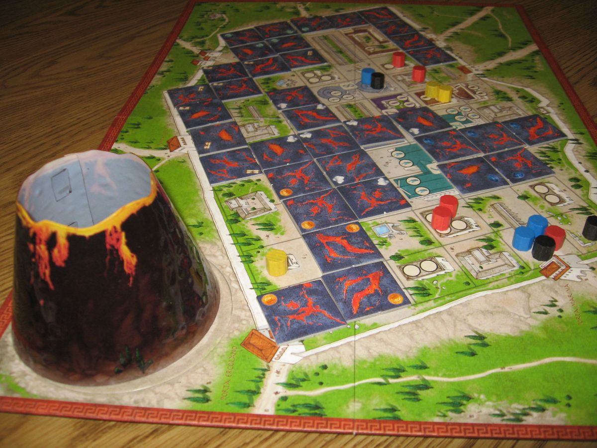 When I teach this game I tell people how mean it is, but I also explain that the game is short enough that it doesn’t leave you feeling miffed at the end.  Mathematical analysis can be your scapegoat as you go after the person who is winning.  At the end of this game there’s always carnage, laughter, and a volcano full of pieces serving as a tie breaker.  Unlike that fateful day in the shadow of the mountain, this is a really good time.