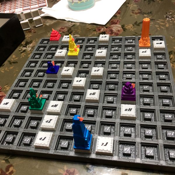 Basically, you’re drawing tiles out of a bag that give you a spot on a 100 or more space (again, versioning) board.  Think Battleship.  You know, like B4 and J10.  That tile is a building you can place into the grid.  If you ever put more than one building next to each other, you can incorporate it and start collecting stock for that building.  The value of that stock depends on the size of the complex when it is inevitably gobbled up by a bigger complex encroaching on its area.  When that happens, people get paid out for their shares.  They can then decide to trade them in 2-1 for the new company or keep them in hopes of starting that company again.