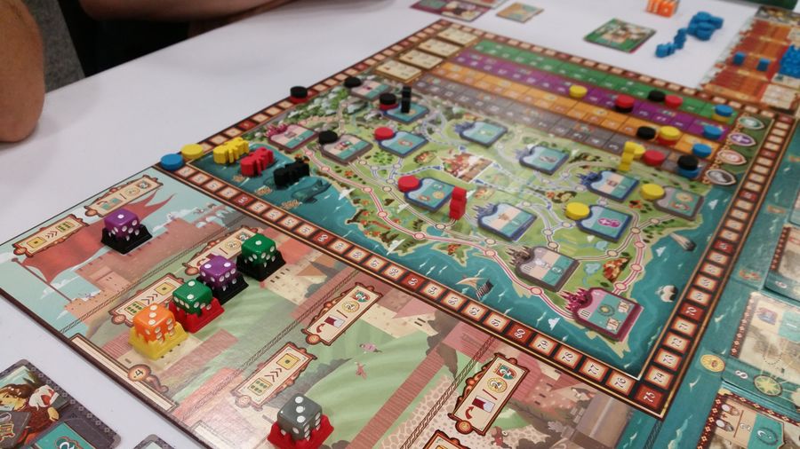 One of my favorite types of games feature mechanisms that are all tied up in a tight little knot.  Every decision you make affects every facet of strategy.  Coimbra fits snugly in this category.  You’re placing dice to sort of bid for the order in which you take cards that then go into a tableau, building an income engine that can ultimately give you end game scoring.  The color of the die you place moves markers on different matching tracks, and, if I remember correctly, do some other things, too.